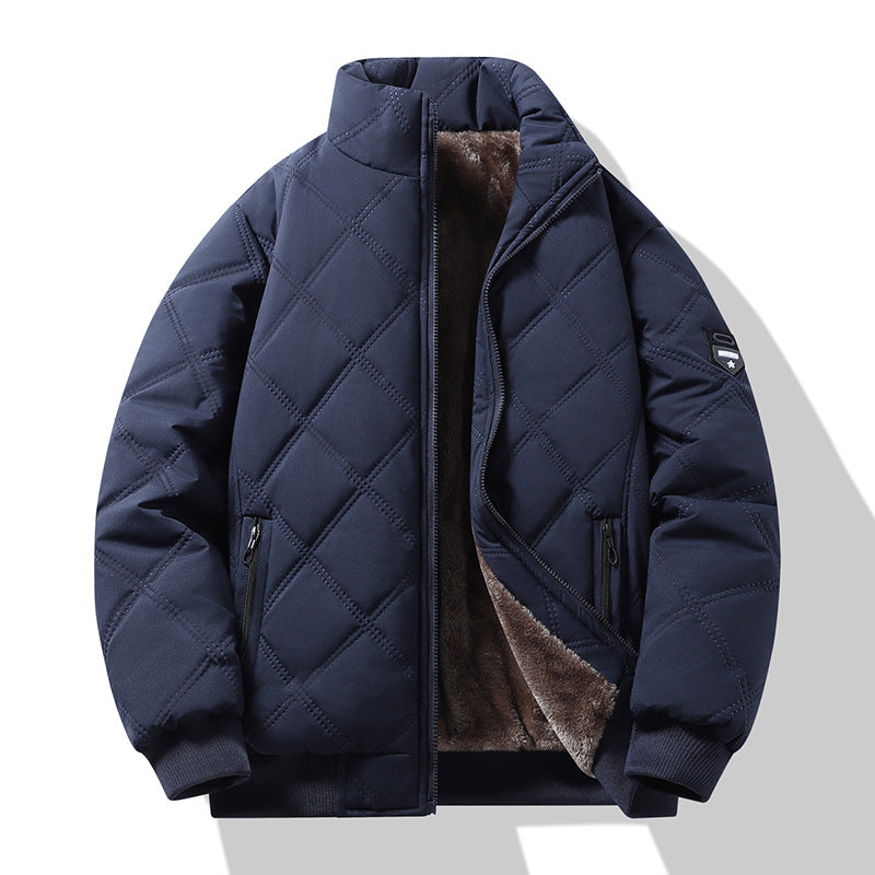 Engineered for comfort, this bomber jacket pairs its rich quilted pattern with a cozy fur lining that holds warmth through colder days. The high collar and clean cut give it a sharp, effortless look built for the season.