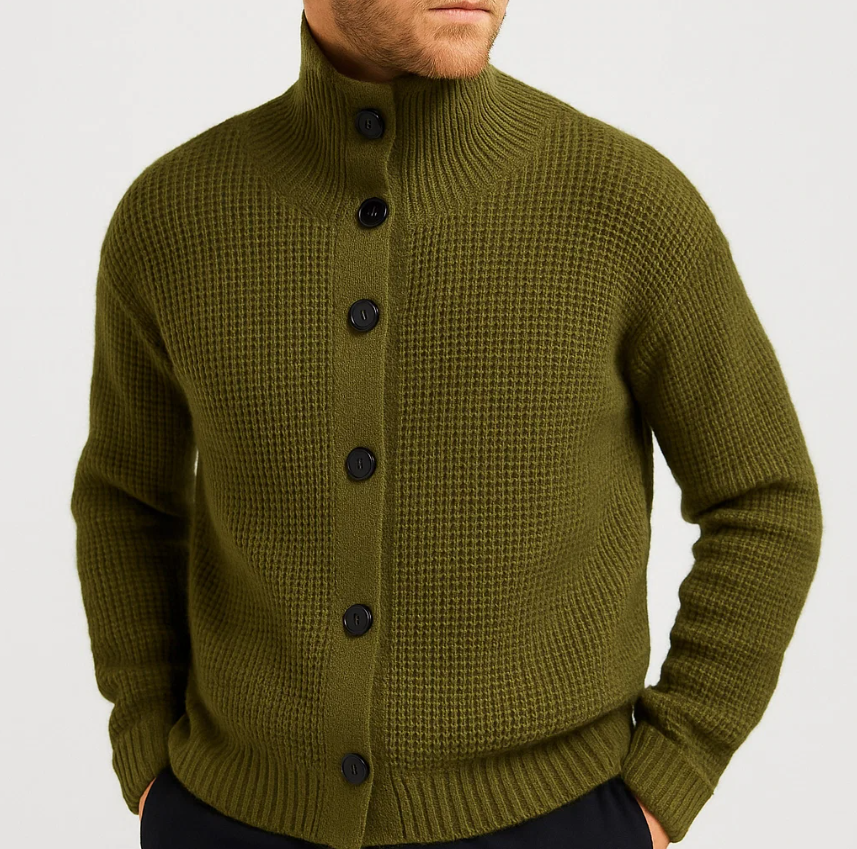 Designed with a waffle-knit weave, this cardigan delivers warmth and comfort that feels built to last. The high-neck and button-up front give it a timeless, refined look suited for colder days.