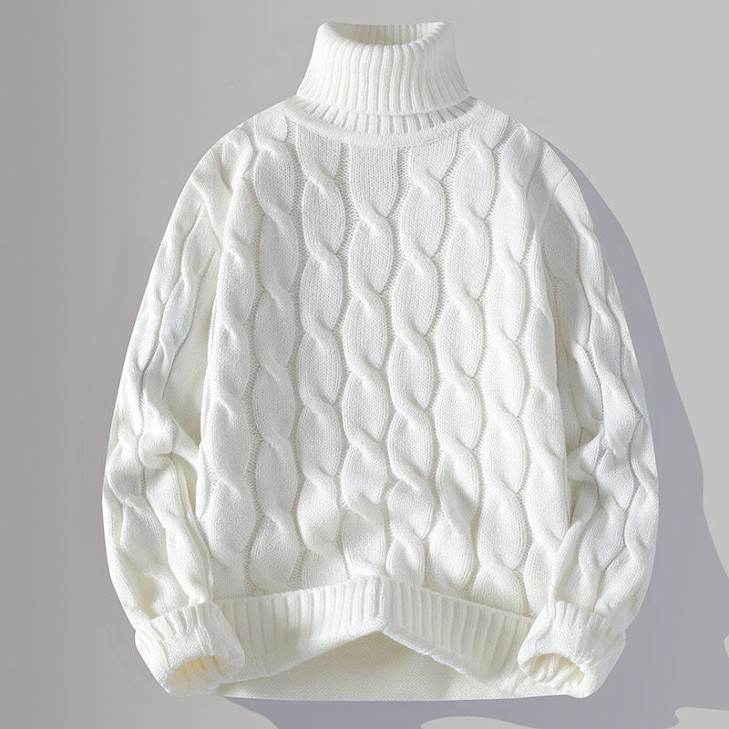 Knitted with a thick cable pattern, this sweater delivers soft warmth and comfort with every wear. Its ribbed finish and high turtleneck collar complete a classic, minimal look.